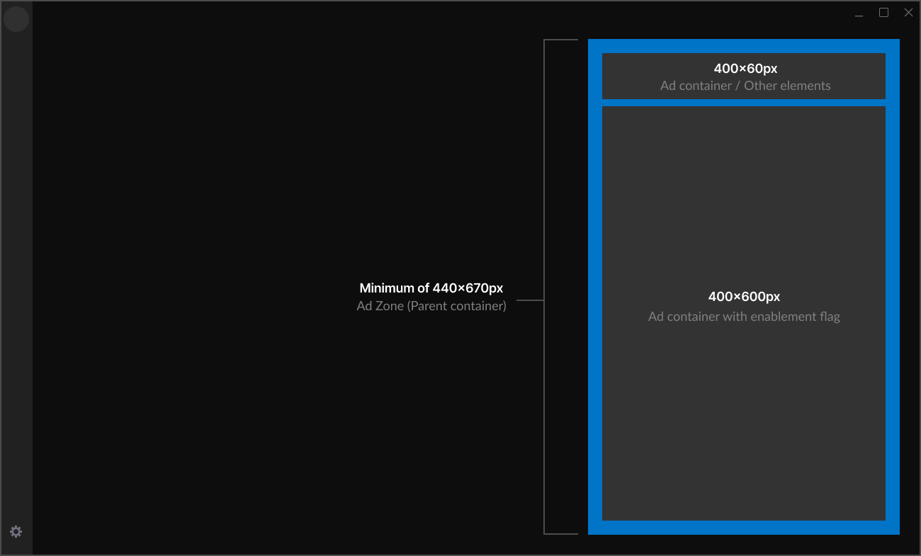 Your app will need to have an ad zone (parent container) (<div>). This is an area of your app that is designated for ads. You can add one or more individual ad containers of smaller sizes to the ad zone.